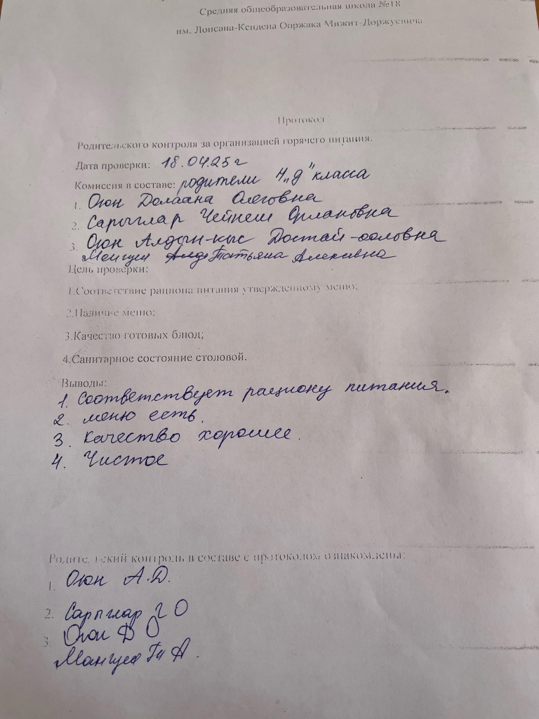 Восемнадцатого апреля состоялся очередной родительский контроль, в котором приняли участие родители учеников четвёртого «Д» класса. В ходе проверки родители ознакомились с утверждённым меню и качеством приготовленных блюд. Также они провели инспекцию санитарного состояния обеденного зала. Родители высоко оценили качество блюд.